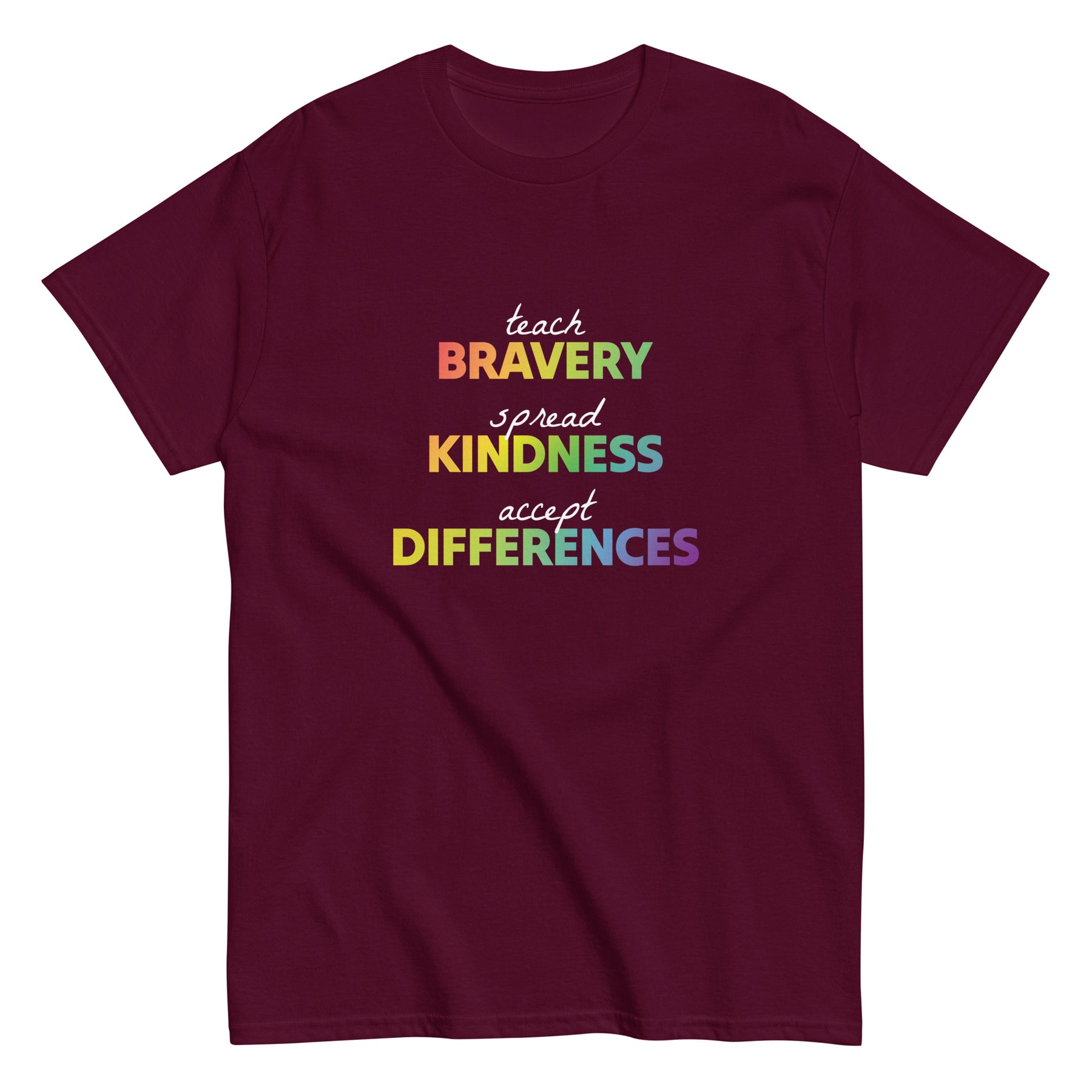 Celebrate kindness and inclusivity with this bold and comfortable tee. Featuring the inspiring message “Back Bravery, Spread Kindness, Accept Differences”, this shirt is perfect for anyone who believes in standing up for courage, compassion, and diversity.