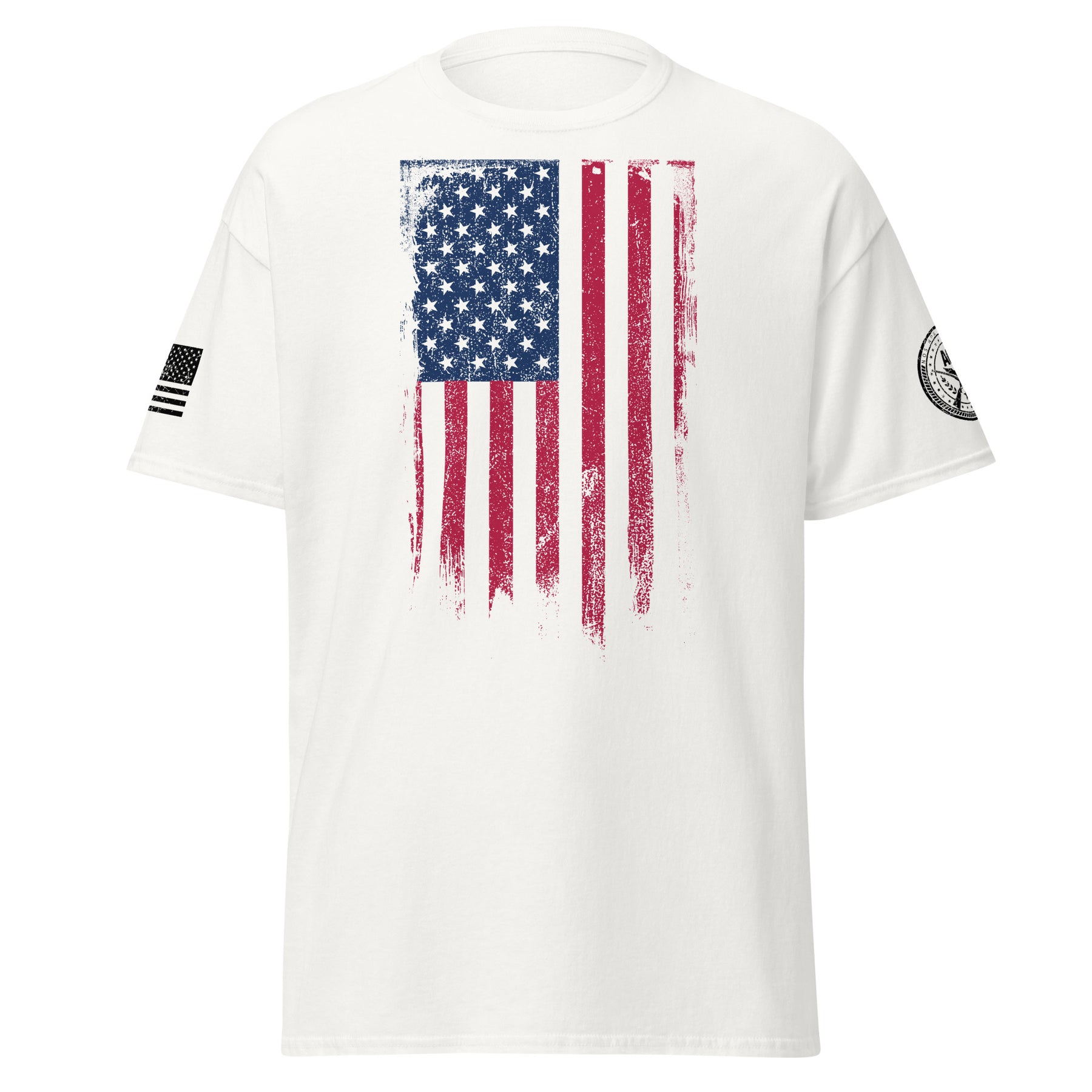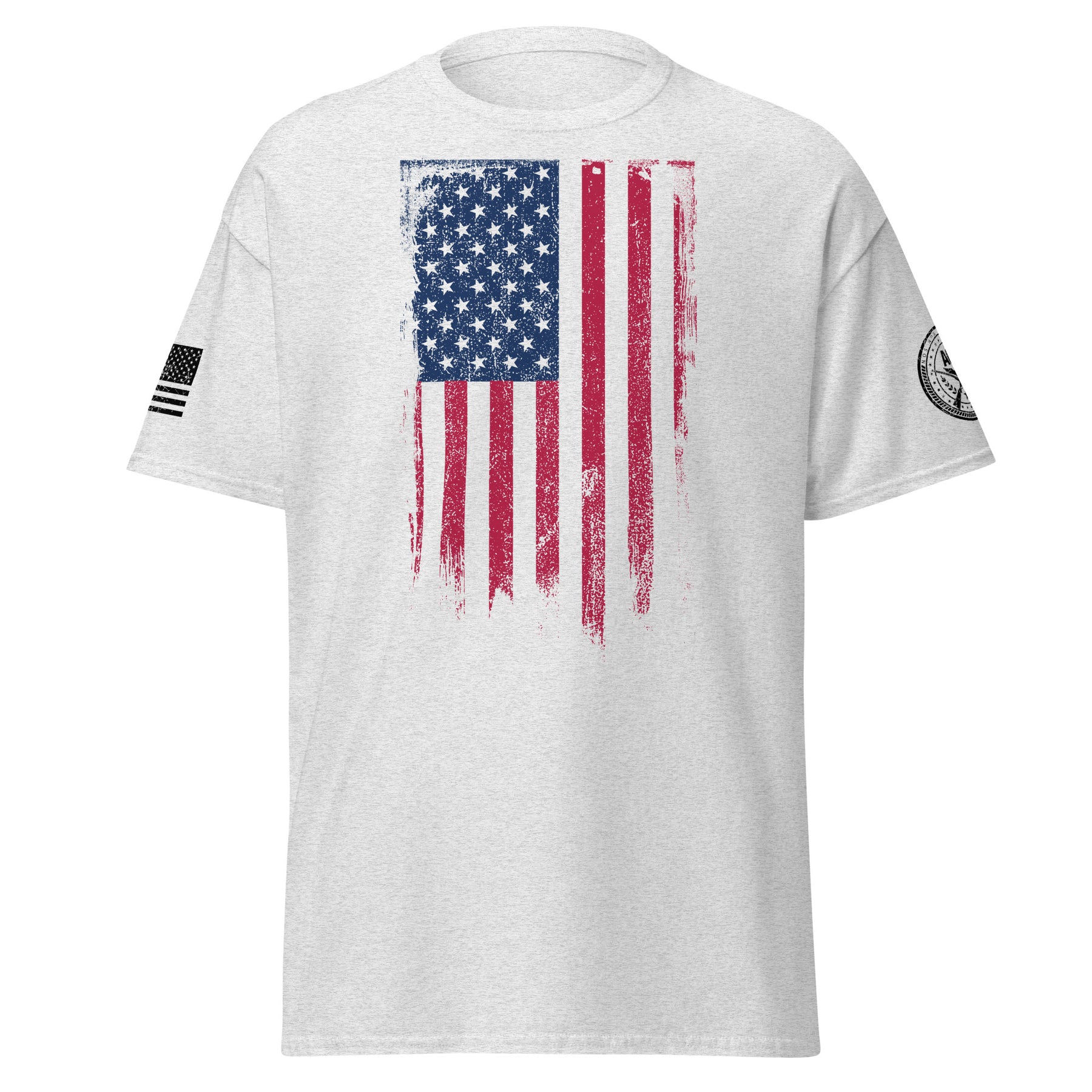 Show your pride in the stars and stripes with the Distressed American Flag Tee — a modern take on a timeless symbol of freedom. Featuring a weathered flag print across the chest and sleeve graphics that add an extra patriotic touch, this shirt balances bold style with everyday comfort.