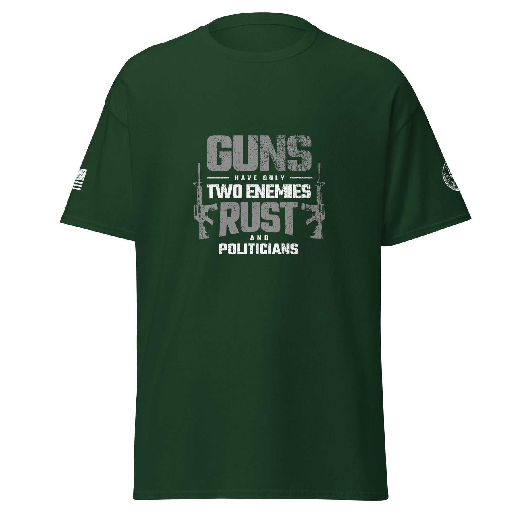 Speak your mind with the “Guns Have Two Enemies: Rust and Politicians” tee — a bold statement that pulls no punches. Made for patriots, firearm enthusiasts, and freedom defenders, this shirt blends attitude and comfort in one durable package.