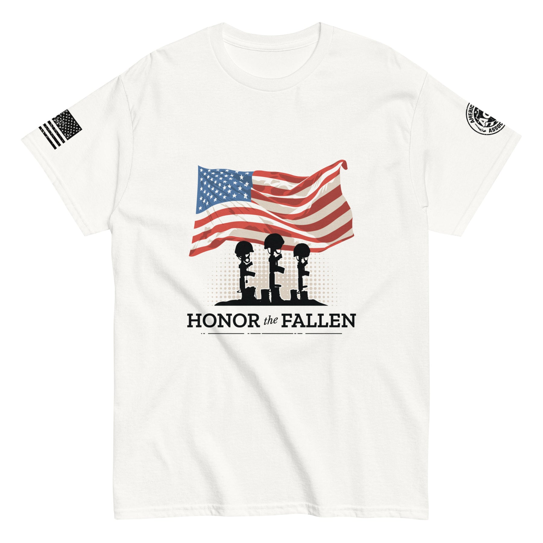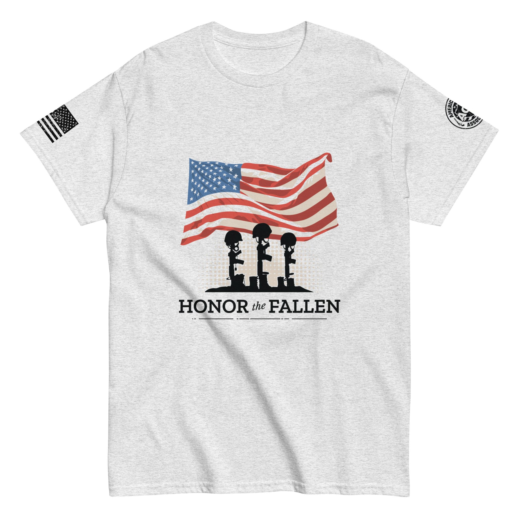 Show your respect and pride with the Honor the Fallen Tee — a bold tribute to those who served and sacrificed. Featuring a detailed American flag and soldier silhouette design on the front, and symbolic sleeve prints on both arms, this shirt embodies strength, remembrance, and unity.