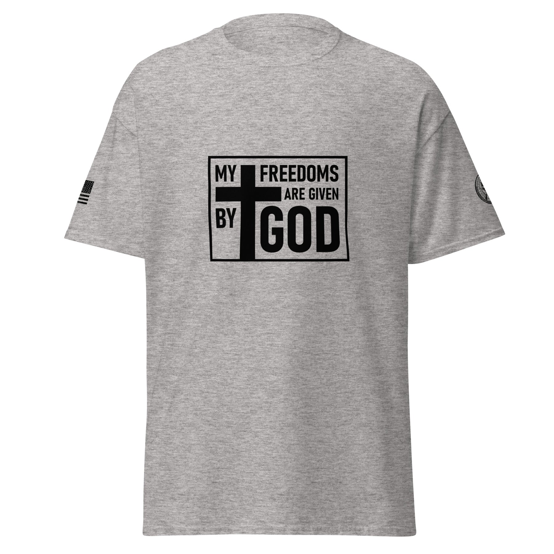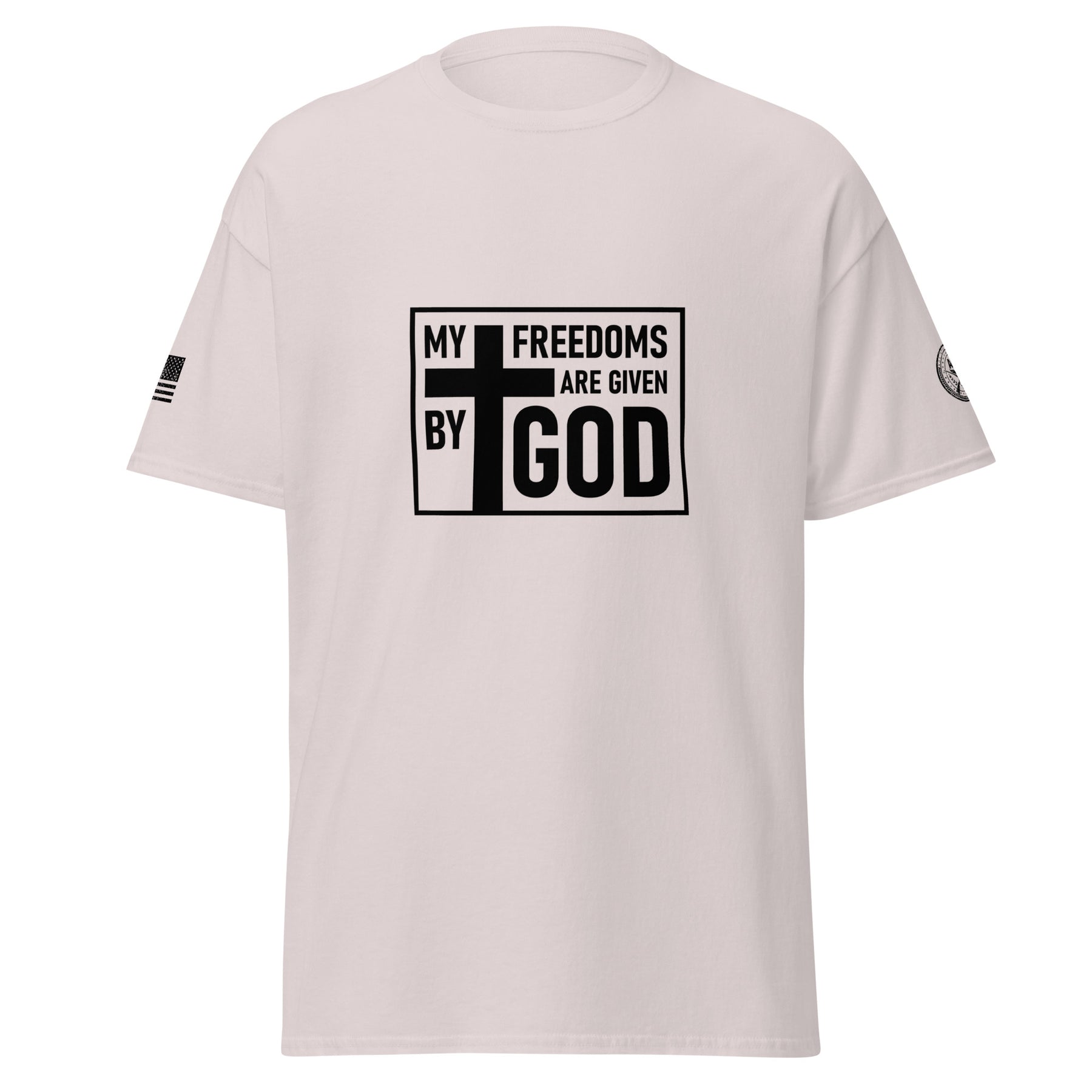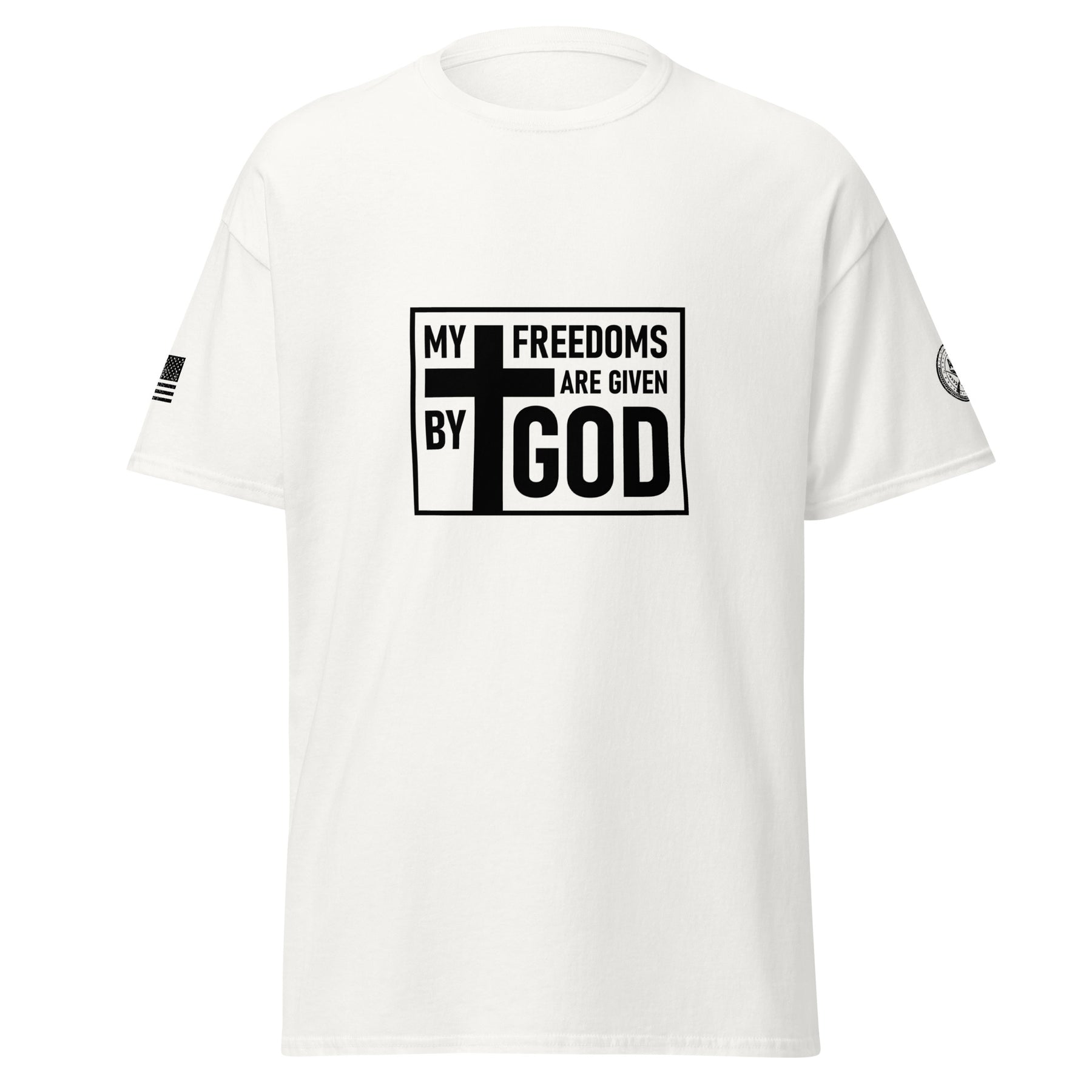 Stand firm in your faith and your freedom with the My Freedoms Are Given by God Tee. Featuring a bold front design and sleeve prints, this shirt delivers both comfort and conviction — perfect for anyone who proudly believes that true liberty comes from above, not man.