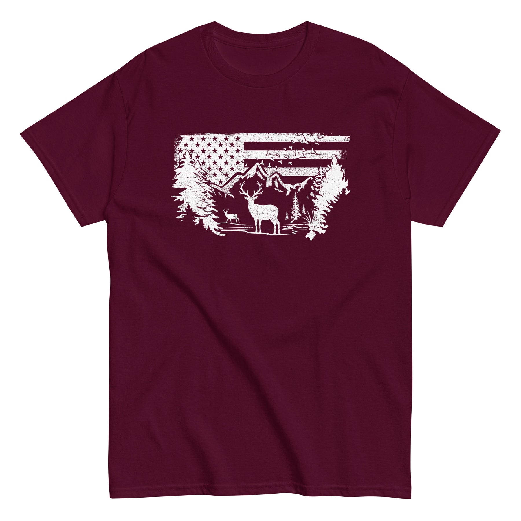 Show your love for the outdoors and American pride with this Patriotic Wilderness Tee. Featuring a bold front design of wildlife against a distressed U.S. flag backdrop, this shirt is perfect for nature lovers, campers, hunters, and anyone who enjoys rustic Americana style.