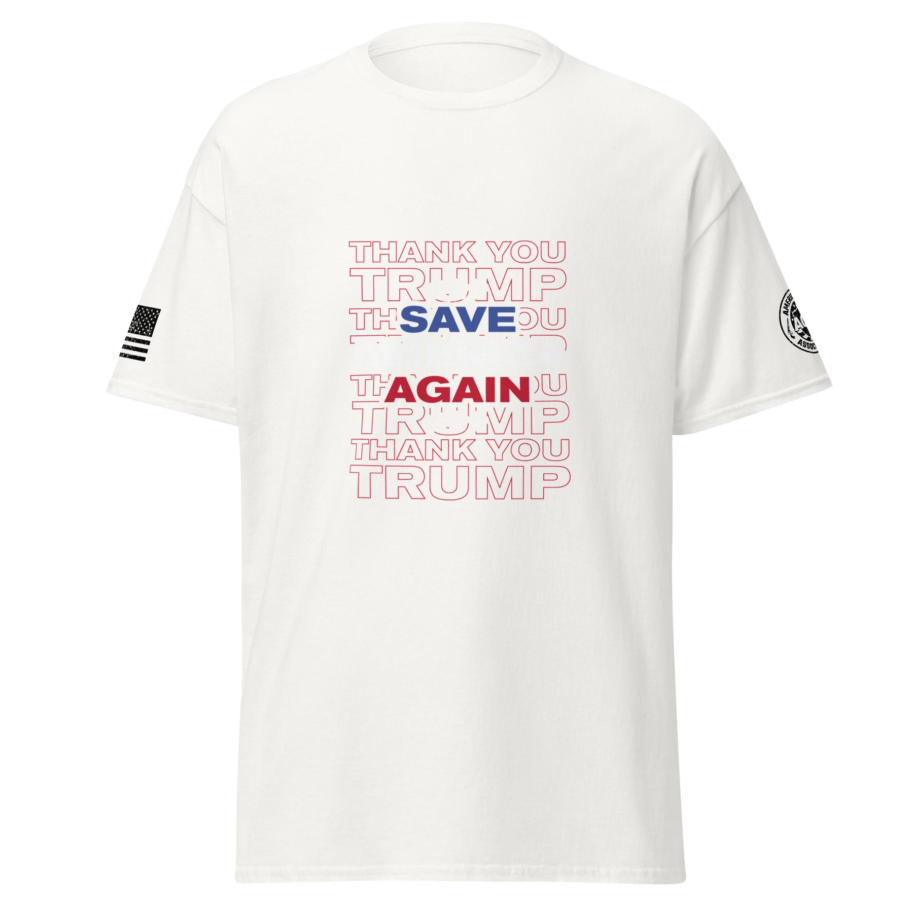 Make your message loud and clear with the Thank You Trump Save America Unisex Tee. Built on the trusted Gildan 5000, this shirt combines softness, durability, and classic everyday comfort. The bold front print and sleeve graphics make it a standout piece for rallies, gatherings, or casual wear.