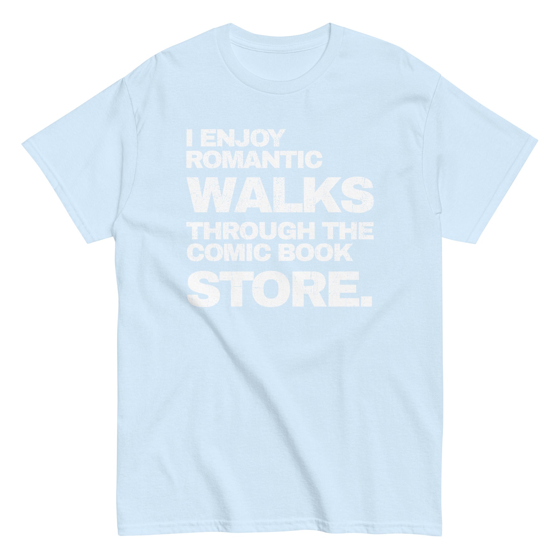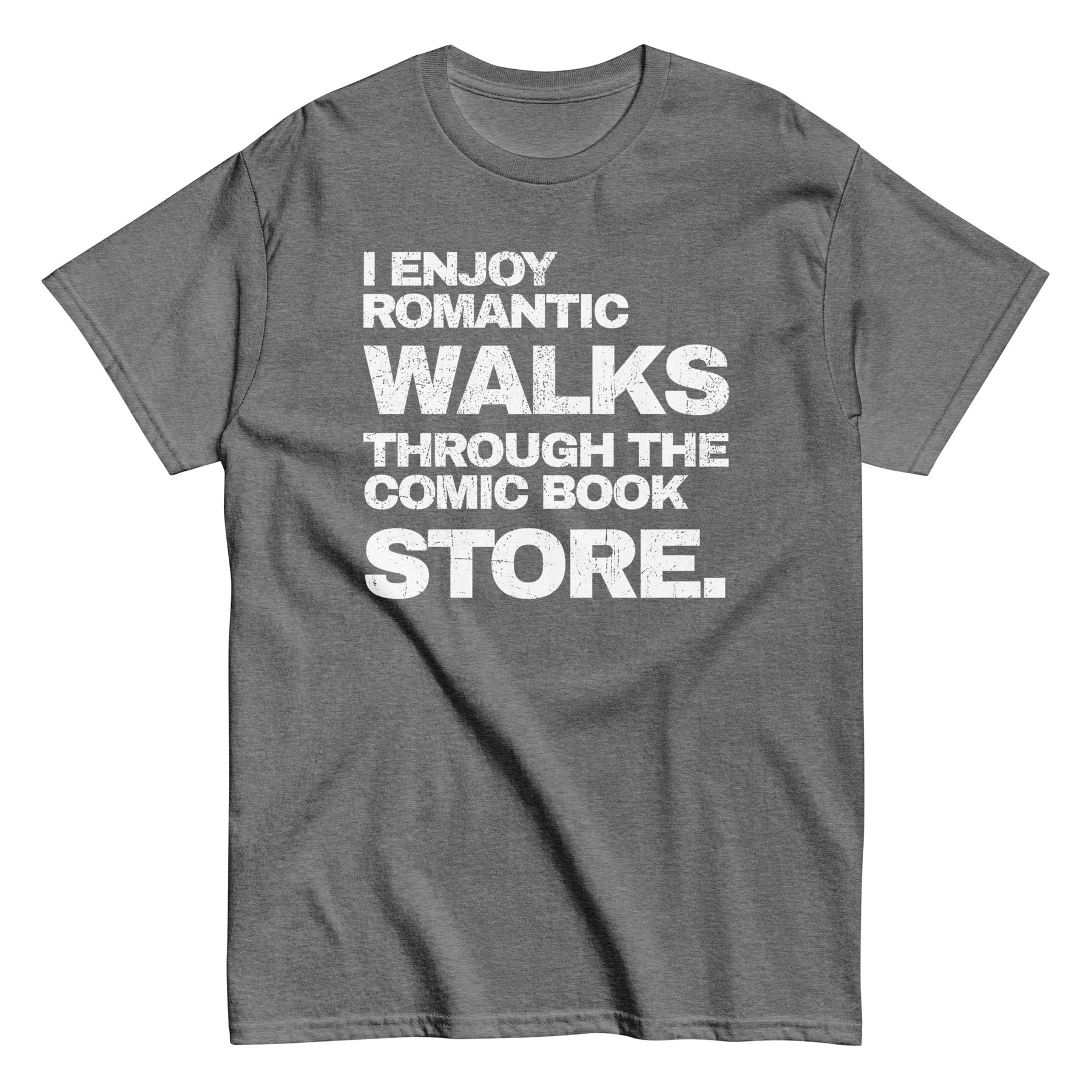 Show off your love for comics and your sense of humor with this “Romantic Walks Through the Comic Book Store” tee. It’s the perfect shirt for comic fans, collectors, and anyone who knows that true romance smells like fresh ink and new issues.