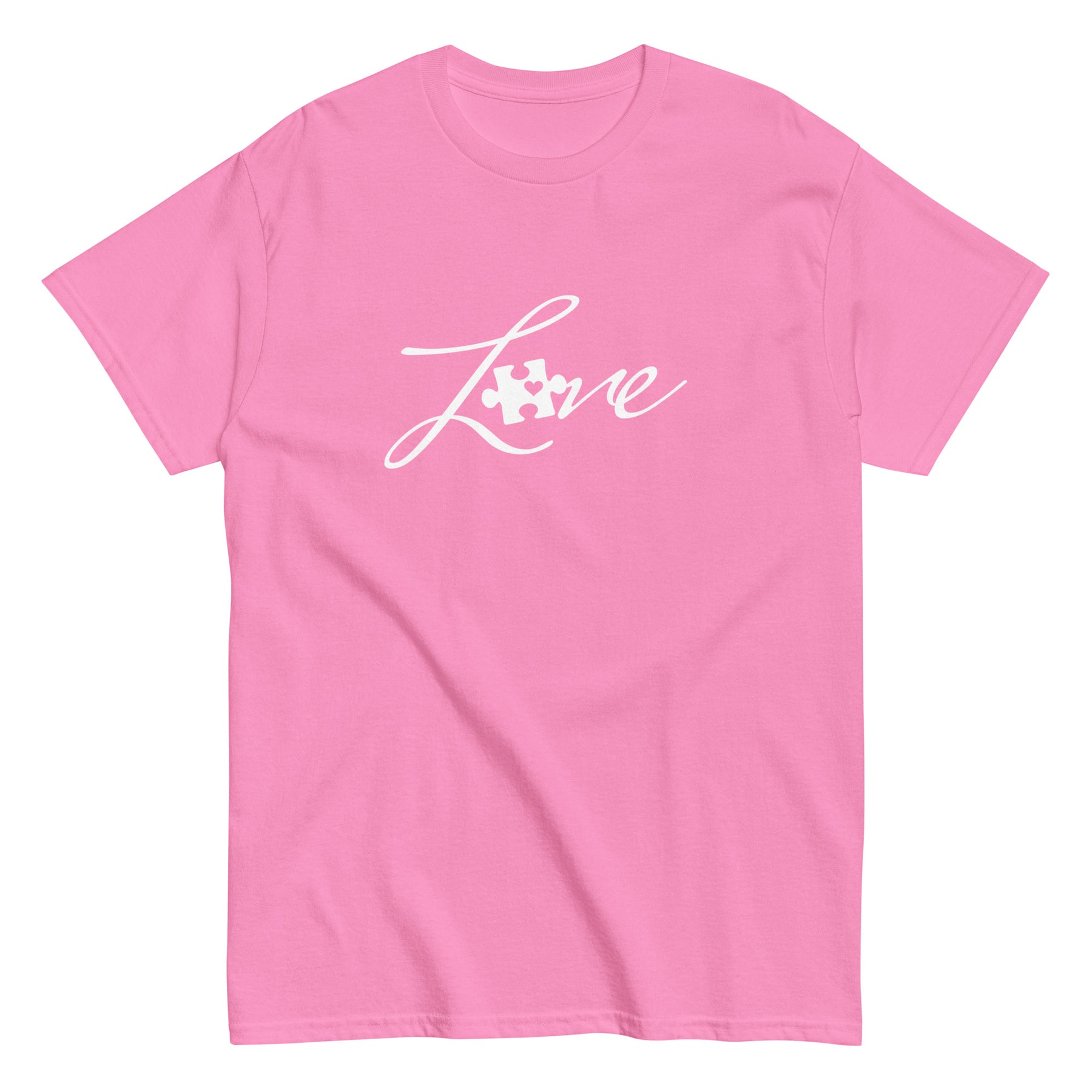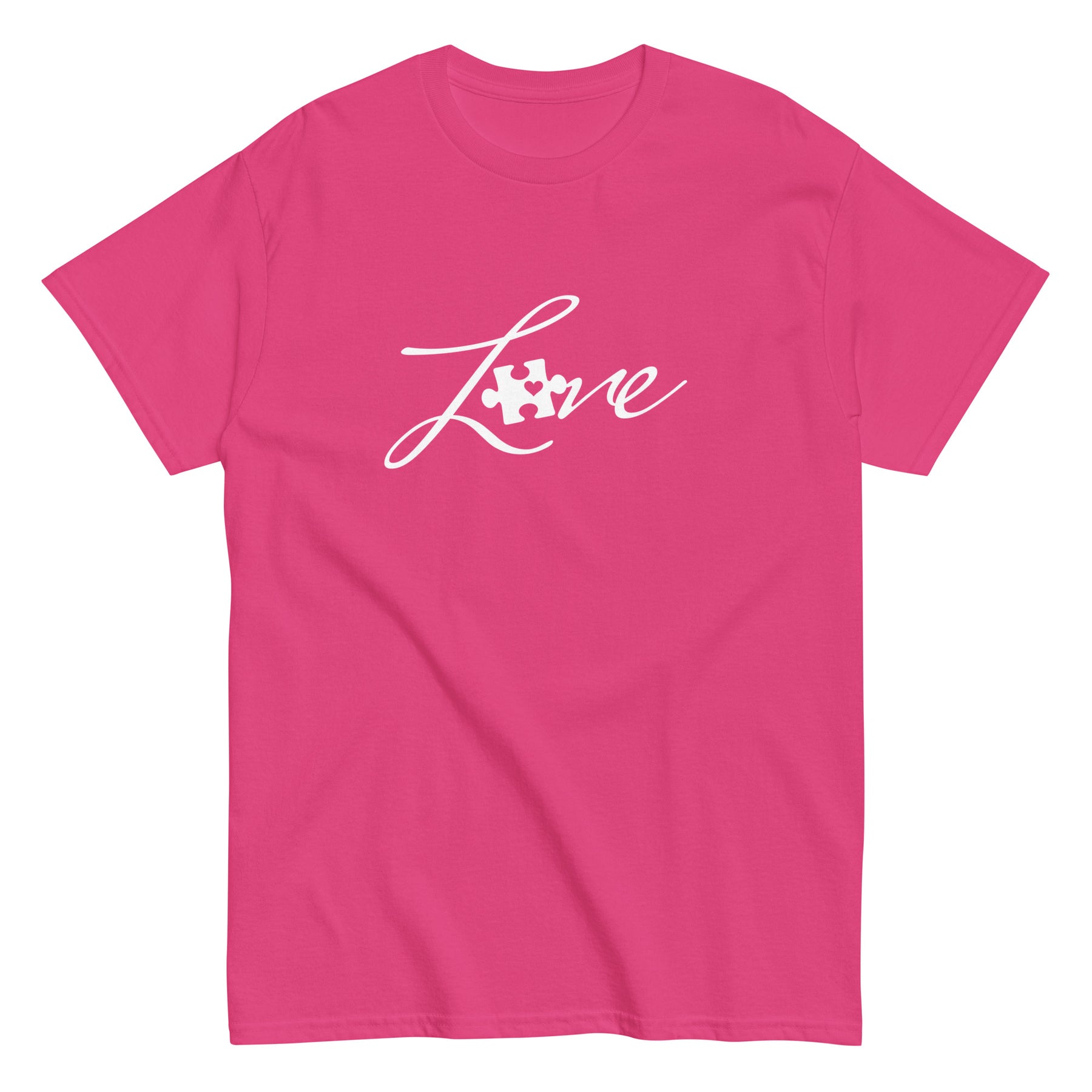 Celebrate love, connection, and support with this Love Puzzle Piece Unisex T-Shirt, crafted on the durable and comfortable Gildan 5000 Classic Tee. Featuring a bold front design with the word Love intertwined with a puzzle piece, this shirt is perfect for spreading awareness and showing pride.