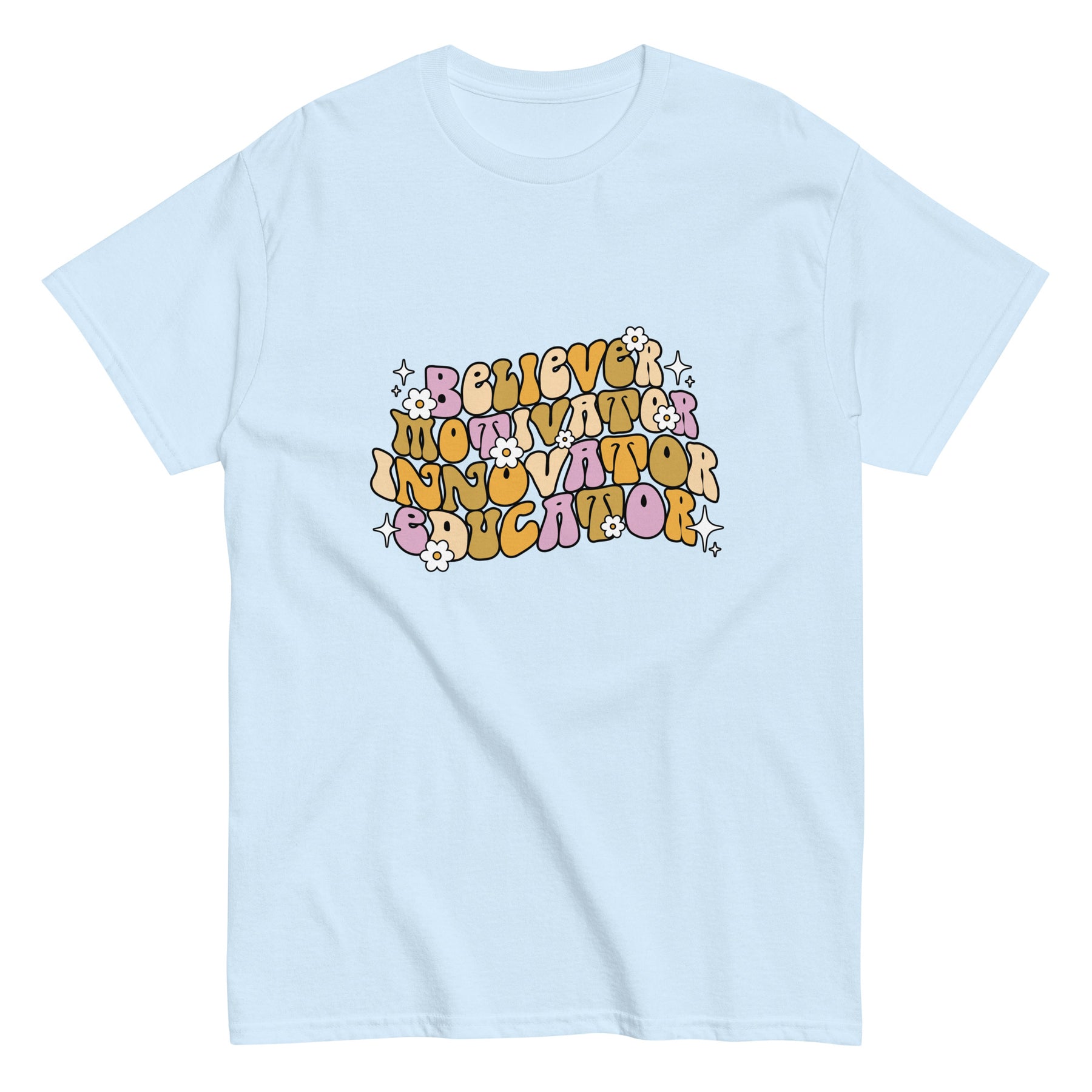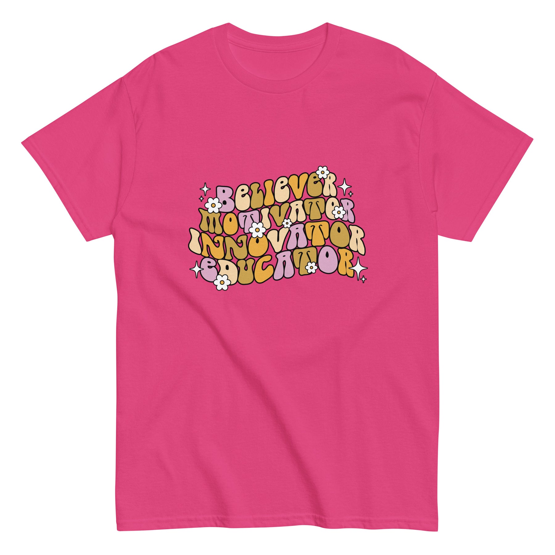 Celebrate the power of teaching with this Believer • Motivator • Innovator • Educator T-Shirt. Featuring a bold, retro-inspired design, this shirt is perfect for teachers who go beyond the classroom and inspire their students every single day.